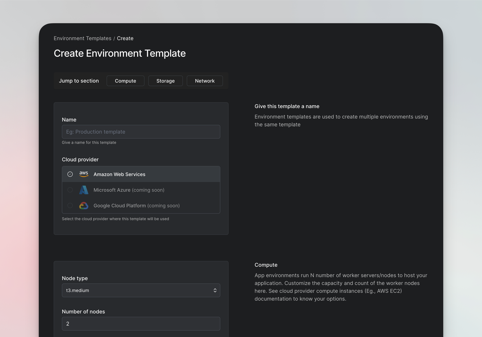 For each app, you can go on to define ideal size configuration of the underlying worker nodes / virtual servers to start their environments in. So that no one gets to under-provision or over-provision Cloud-prem/SaaS/QA environments by mistake.